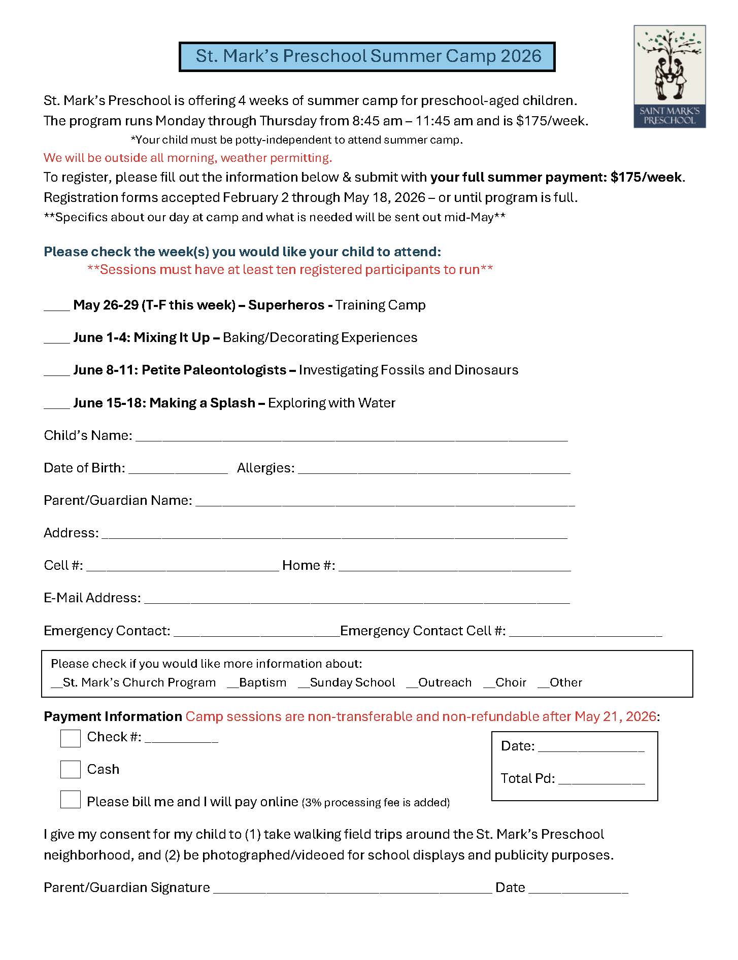 St. Mark’s Preschool is inspired by the Reggio Emilia philosophy of early education which encourages children to explore their environment and to express themselves through the spoken word, drawing, painting, and many of the other “hundred languages” by which young children discover their world.